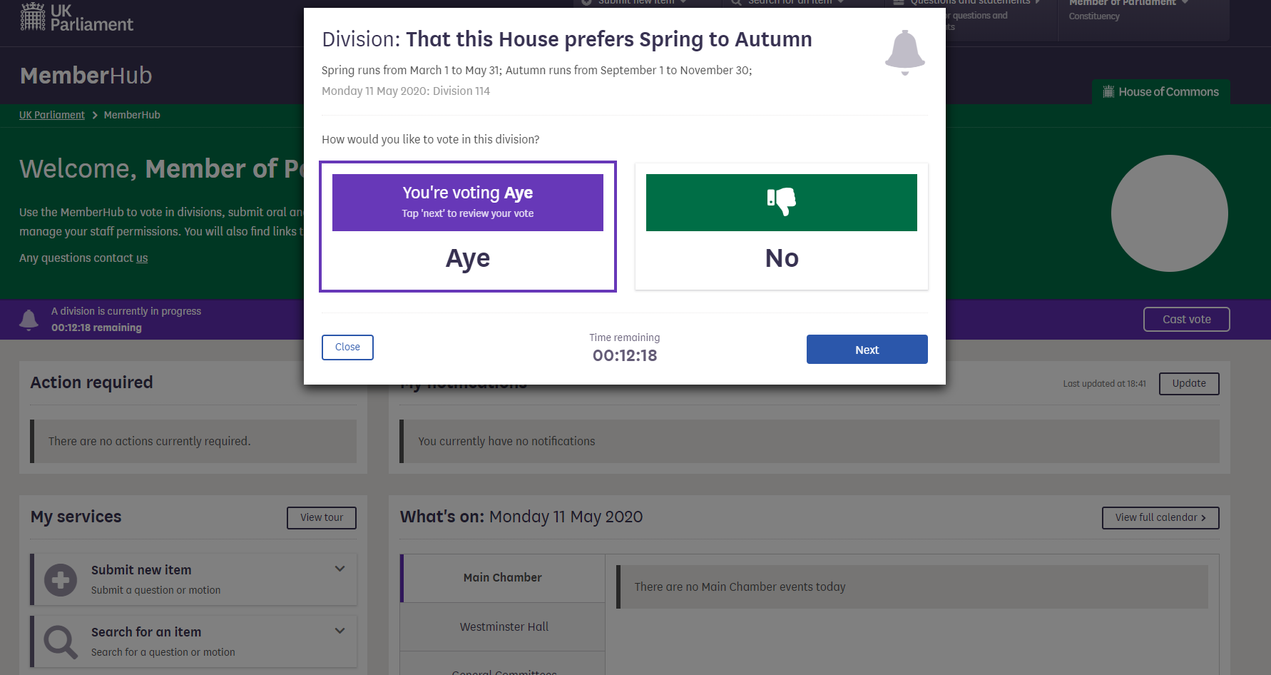 - In the UK, Members of the House of Lords, previously summoned by the division bell to vote in a crowded lobby, are met instead by the gentle buzz of a phone in their pocket, notifying them that it is time to tap: aye or no, confirm, submit.