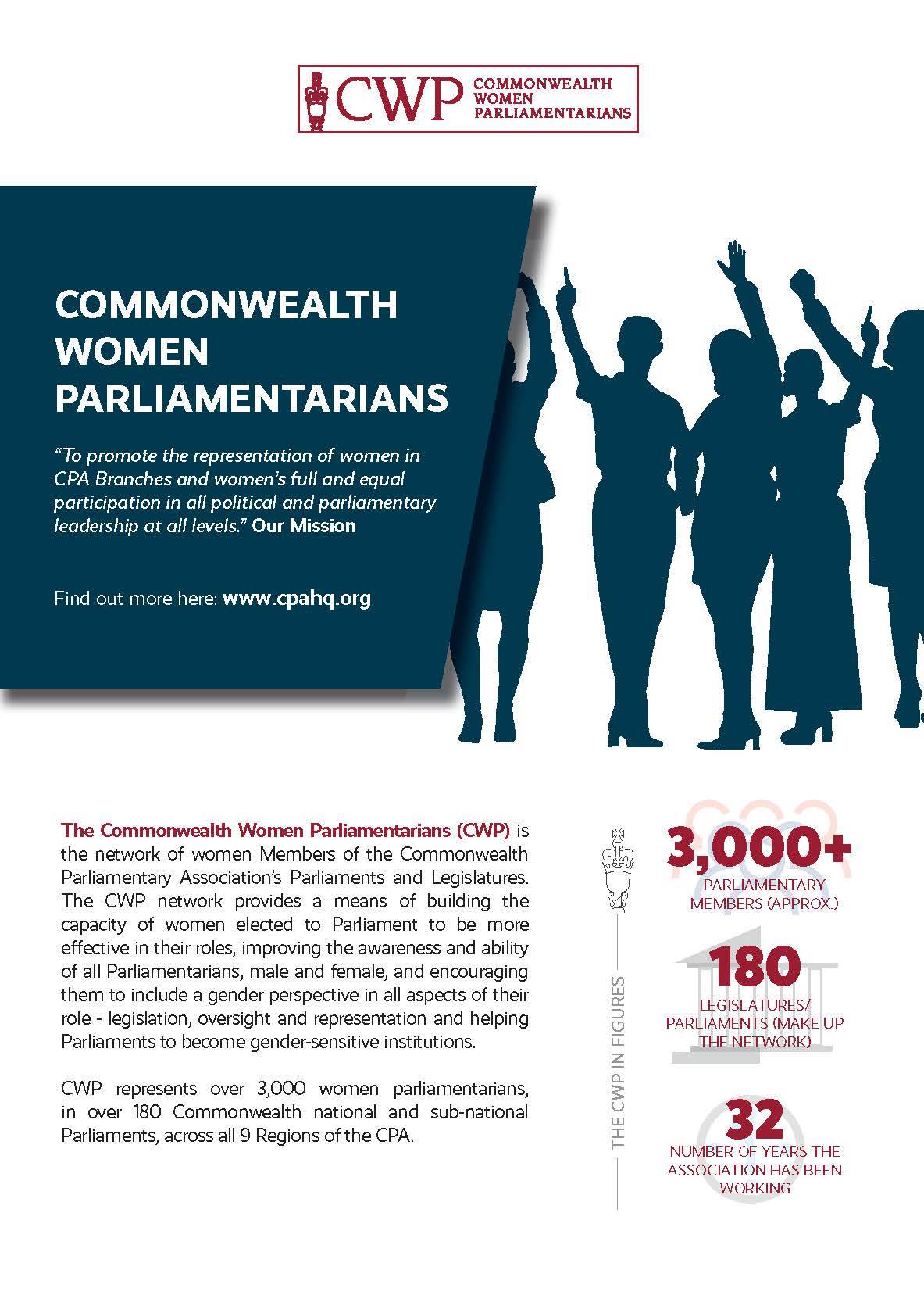 The Commonwealth Women Parliamentarians (CWP) was founded in 1989 to increase the number of female elected representatives in 180 Parliaments and Legislatures across the Commonwealth and to ensure that women’s issues are brought to the fore in parliamentary debate and legislation. The network campaigns for gender equality in all spheres. For media enquiries, please contact communications@cpahq.org.