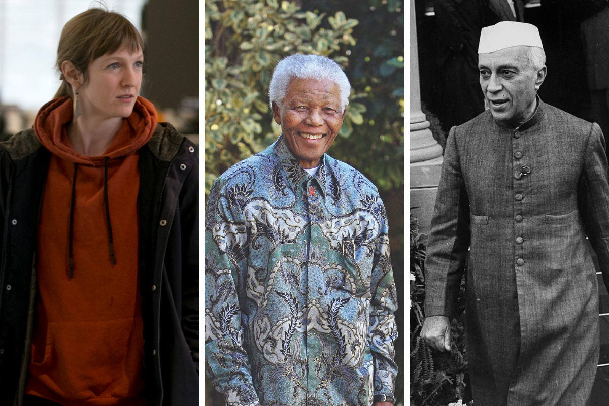 Above: Quebec MNA Catherine Dorion, who was removed from the chamber for wearing a hoodie, Nelson Mandela wearing a Madiba shirt and Jawaharlal Nehru wearing a 'Nehru collar shirt.'