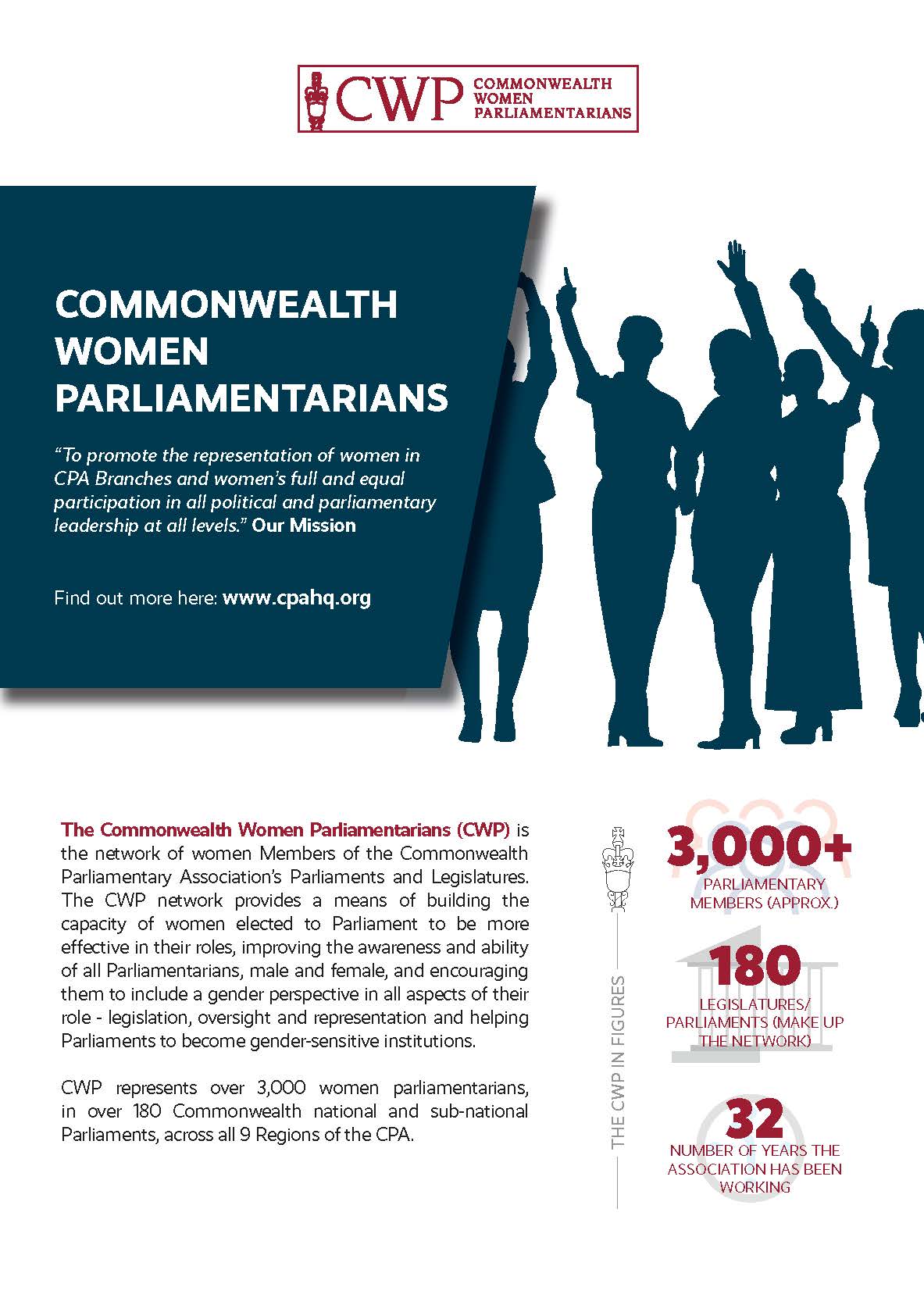 The Commonwealth Women Parliamentarians (CWP) was founded in 1989 to increase the number of female elected representatives in 180 Parliaments and Legislatures across the Commonwealth and to ensure that women’s issues are brought to the fore in parliamentary debate and legislation. The network campaigns for gender equality in all spheres. For media enquiries, please contact communications@cpahq.org.