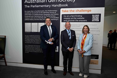 Above: The Speaker of the House of Representatives, Hon. Milton Dick, MP; Steven Fox, the Australian Parliamentary Librarian; and the President of the Senate, Senator Hon. Sue Lines at the launch of the new Australian Parliamentary Handbook website. Image credit: AUSPIC, Department of Parliamentary Services.