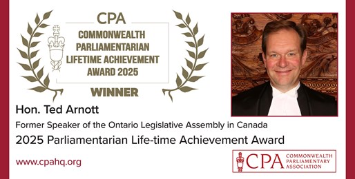 Hon. Ted Arnott is the former Speaker of the Legislative Assembly of Ontario in Canada who has been awarded the 2025 Parliamentarian Life-time Achievement Award, in recognition of his 35 years of parliamentary service and his commitment and contributions to the Legislature during that time. Praised for his encouragement to colleagues and an ability to inspire greater decorum and less divisiveness in the Chamber, Hon. Ted Arnott was also the Dean of Presiding Officers in Canada, sharing his knowledge and expertise with new Speakers from across the country.