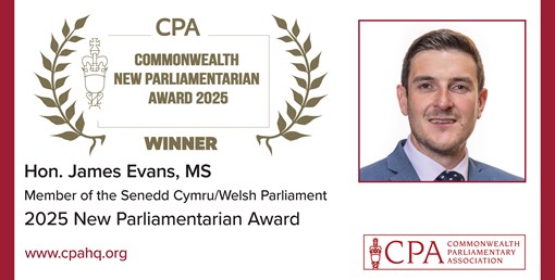 Hon. James Evans, MS from the Senedd Cymru/Welsh Parliament has been awarded the 2025 New Parliamentarian Award in recognition of his contribution to promoting parliamentary democracy. In his first term, he has advanced the principles of good governance through his work with multiple Parliamentary Committees, including the COVID-19 Inquiry Committee. Through cross-party collaboration, he has also fostered bipartisan solutions to national challenges, best exemplified through his work behind the landmark Mental Health Standards of Care Bill.