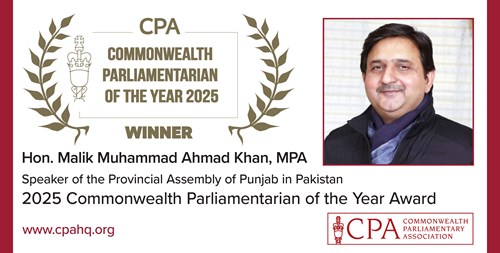 Hon. Malik Muhammad Ahmad Khan, MPA, Speaker of the Provincial Assembly of Punjab in Pakistan was announced as the recipient of the 2025 Commonwealth Parliamentarian of the Year Award in recognition of his transformational leadership and instituting unprecedented reforms that have strengthen transparency, accountability and legislative independence.