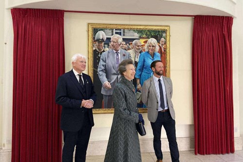 Above: HRH The Princess Royal (centre) with the Bailiff of Jersey, Hon. Robert MacRae (left) and Jersey artist Jason Butler following the unveiling of the new royal portrait. Image credit: ITV Jersey.