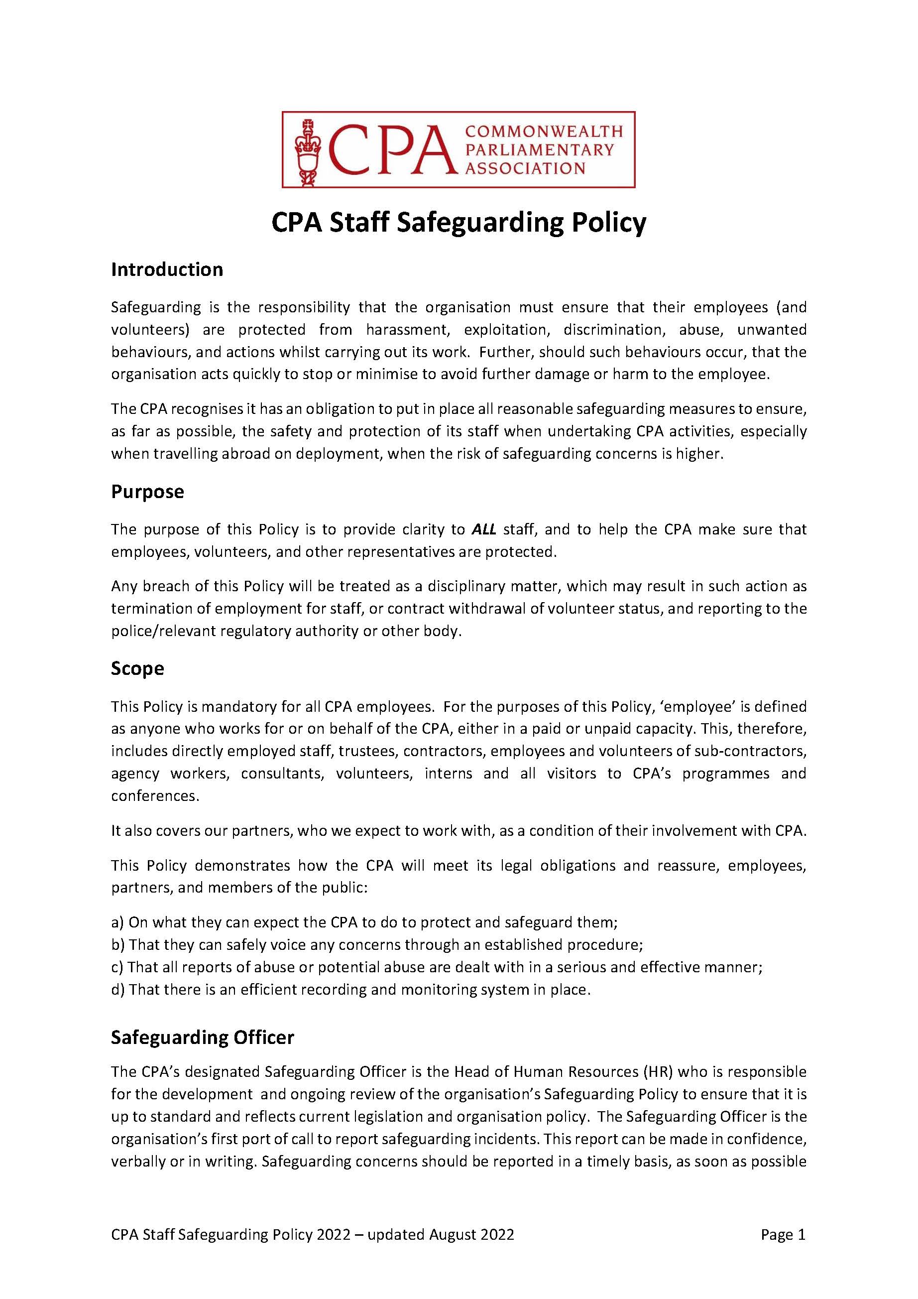 The CPA is committed to its safeguarding responsibilities and ensuring that all those with whom the organisation encounters during its work, activities or as participants at its conferences and seminars are protected from harassment, exploitation, discrimination, abuse, or unwanted behaviours.